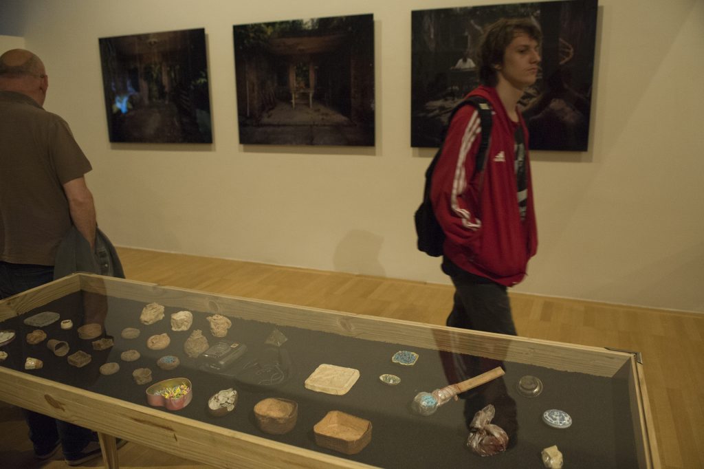 An installation consisting of one painting, 3 photographs and 2 vitrines.
