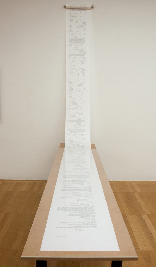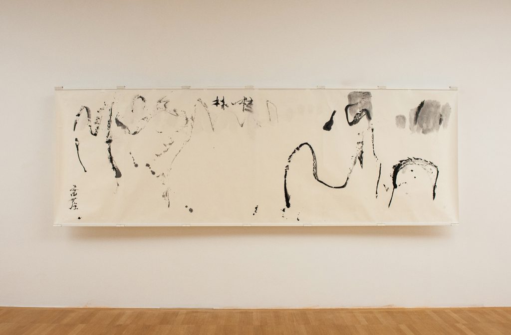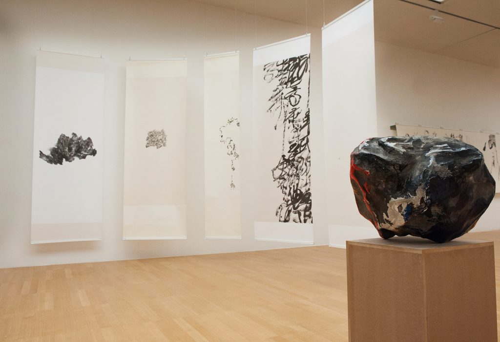 Paper comes from wood, a growing material that complements and ‘adds’ to the potentiality of Emptiness. The Stone represents the condensation of matter; its presence ‘reduces’ the potentiality of Emptiness. The calligraphic line draws the Stone as well as the Word; the line untangled undoes both the Stone and the calligraphic Word. In this constellation, scrolls, stones and ‘word-knots’ come together in various states of potentiality.