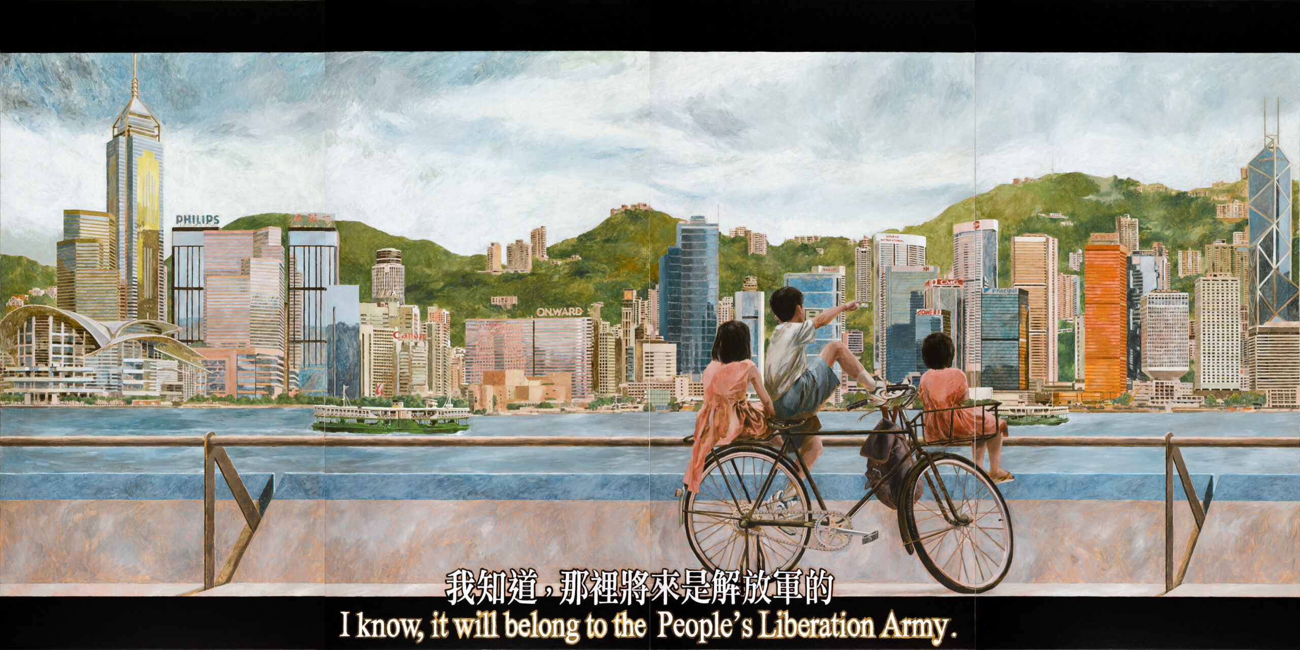 Under such tumultuous conditions, it is less a question of standing firm and reflecting on Hong Kong identity, as of having no firm ground to stand on at all. In one of the key paintings in I Have Nothing to Say, the artist telescopes back in time and picks out a scene from Fruit Chan’s film Little Cheung (2000), set in 1997. Executed in a gentle, luminous palette, the painting depicts three children perched on a bicycle and looking out at the Victoria Harbour skyline on the eve of the Handover. The boy, Little Cheung, points out the Tamar site—at the time the headquarters of the British Army—and one of the little girls (who are both illegal immigrants from the Mainland), proudly says: ‘I know, it will belong to the People’s Liberation Army’.