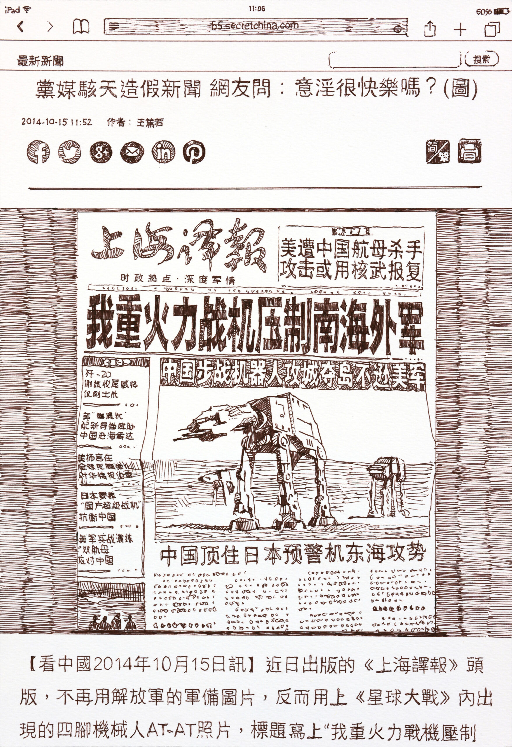 The first is comprised of images I have captured from my mobile phone of postings from electronic media/ social platforms such as Facebook, WhatsApp and WeChat. Some of these postings are from actual newspaper articles or other media reports, others are clearly political propaganda: but what they all have in common is that they are either deceptive information or outright lies, of the kind we encounter on a daily basis. From the huge amount of data I collected, I have made a selection of 49 of these capture images and turned them into drawings on paper.