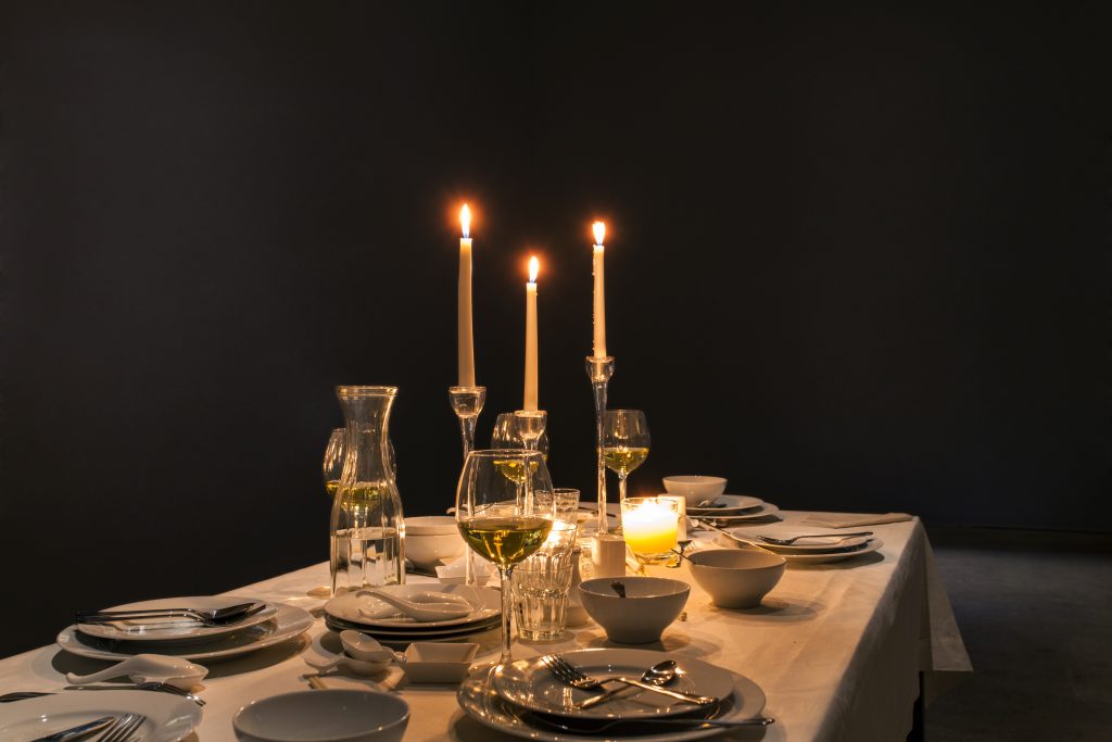 In many of his works, Yuan creates scenarios where the unthinkable invades the mundane world. In the titular video and photographic installation Dwelling, Yuan captures the sudden explosion of an IKEA-like, middle-class living room that is inexplicably underwater, while in the installation Prophecy, a dinner table carefully set with china and glass periodically emits an ear-splitting clanking sound and shakes as though impelled by an earthquake. Though the human figure is absent from these works, the human presence is viscerally embodied in the objects that inhabit these most ordinary dwelling spaces.
