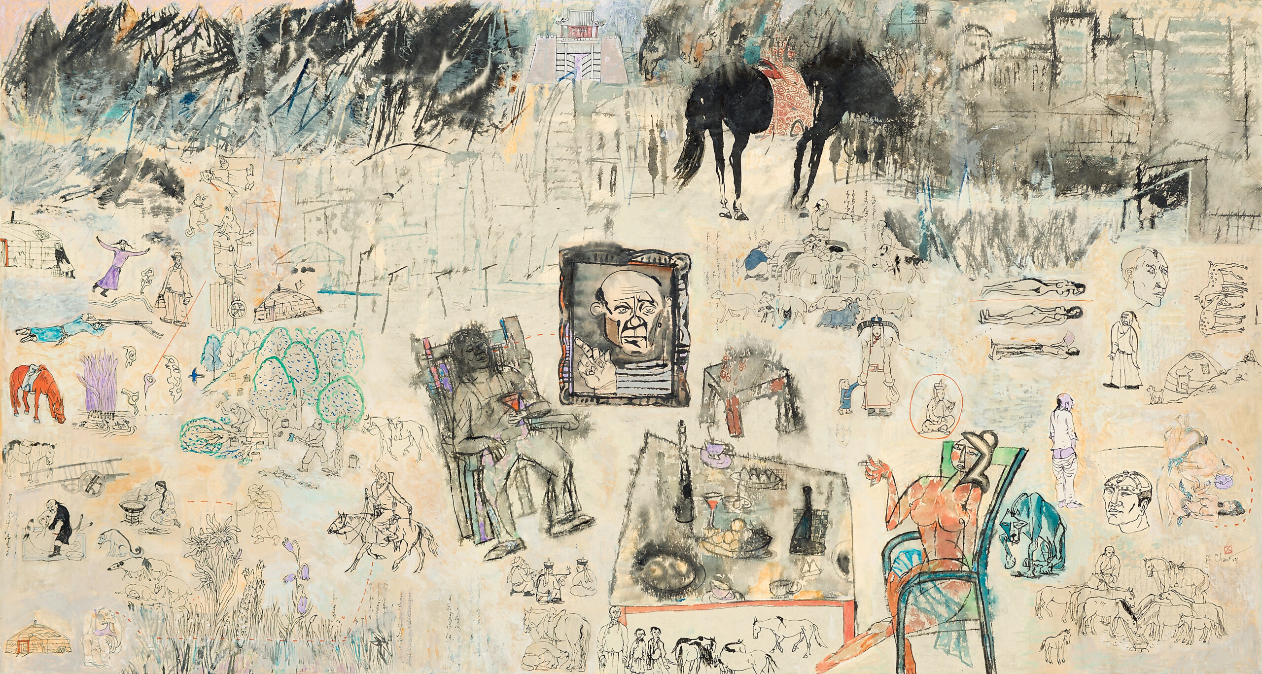 Early in his career Wei Dong was already known for his intricate technique and complex compositions. In both ink art and oil painting, his signature style is a crowded surface packed with cultural artefacts and erotic bodies. The works reflect the era of revolutionary changes when objects from a former era suddenly become obsolete. A new era brings in a new order. Human desire follows the times, and erotic seduction seeks new narratives. Wei Dong’s later landscapes return to a classical world in which Nature brings back an order that provides human protagonists classical roles. Here human activities are performed as reenactment of mythic tales and mysteries.