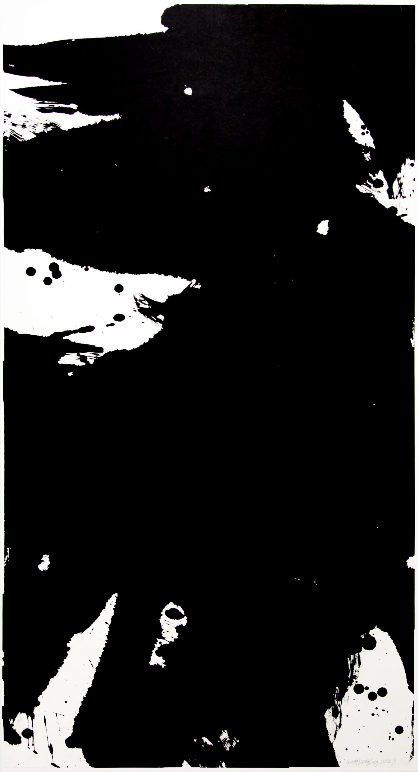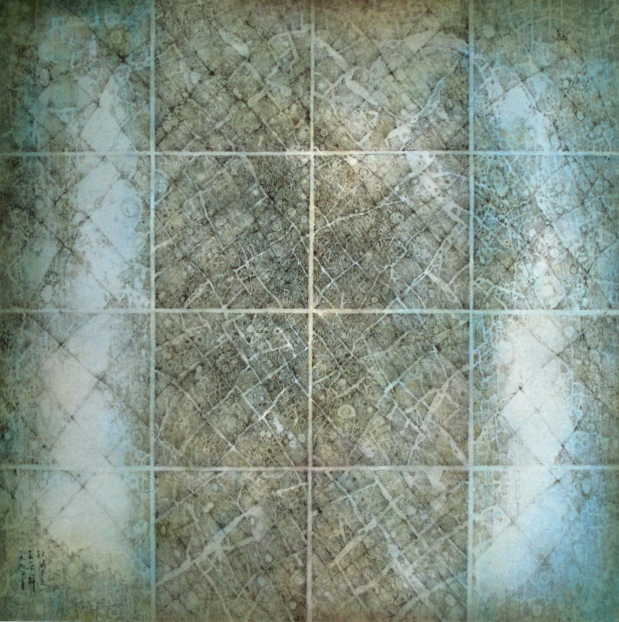 This historical work in ink on paper was created in 1997 for Gu Wenda’s important installation series United Nations: The Mythos of Lost Dynasties. which include monumental ‘texts’ woven of human hair, and which the artist has staged all over the world. Trained as an ink painter at the Zhejiang Art Academy (now the China Academy of Art) in Hangzhou, Gu began doing conceptual work in the 1980s and was the first artist to work with so-called ‘error-word’ calligraphy—invented scripts that appear to be real Chinese characters but which are actually unreadable. This installation of four large error-word characters surrealistically positioned against an ink landscape background and marked with a red cross is one of the most dynamic and representative works from this important period of Gu’s oeuvre.