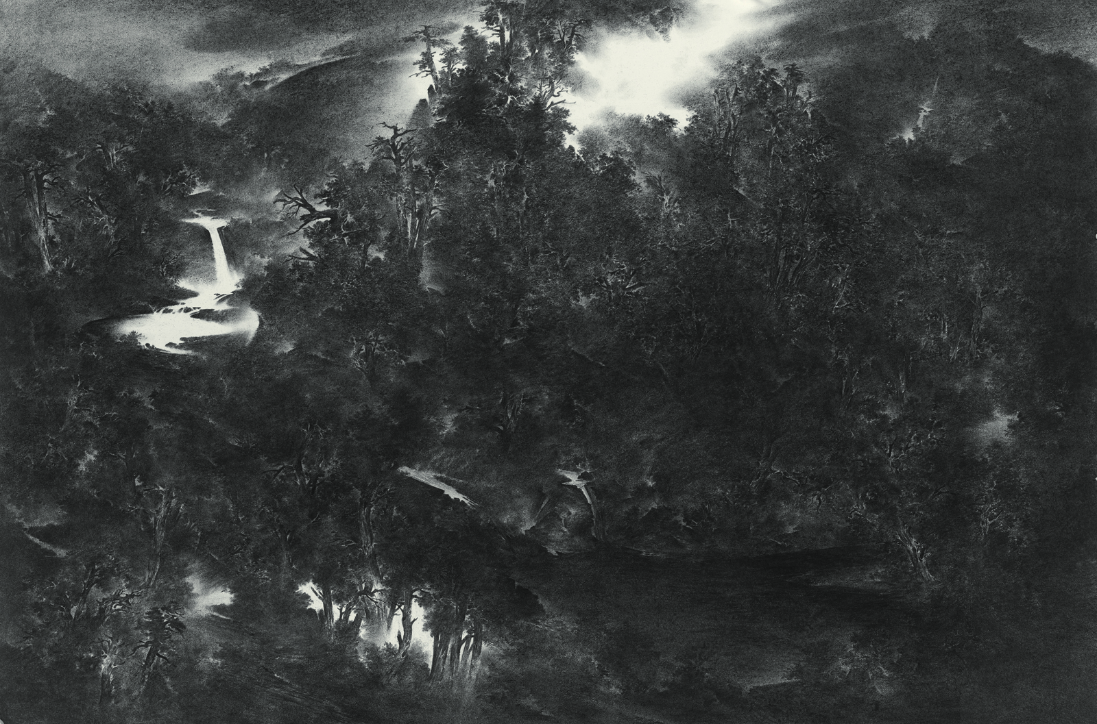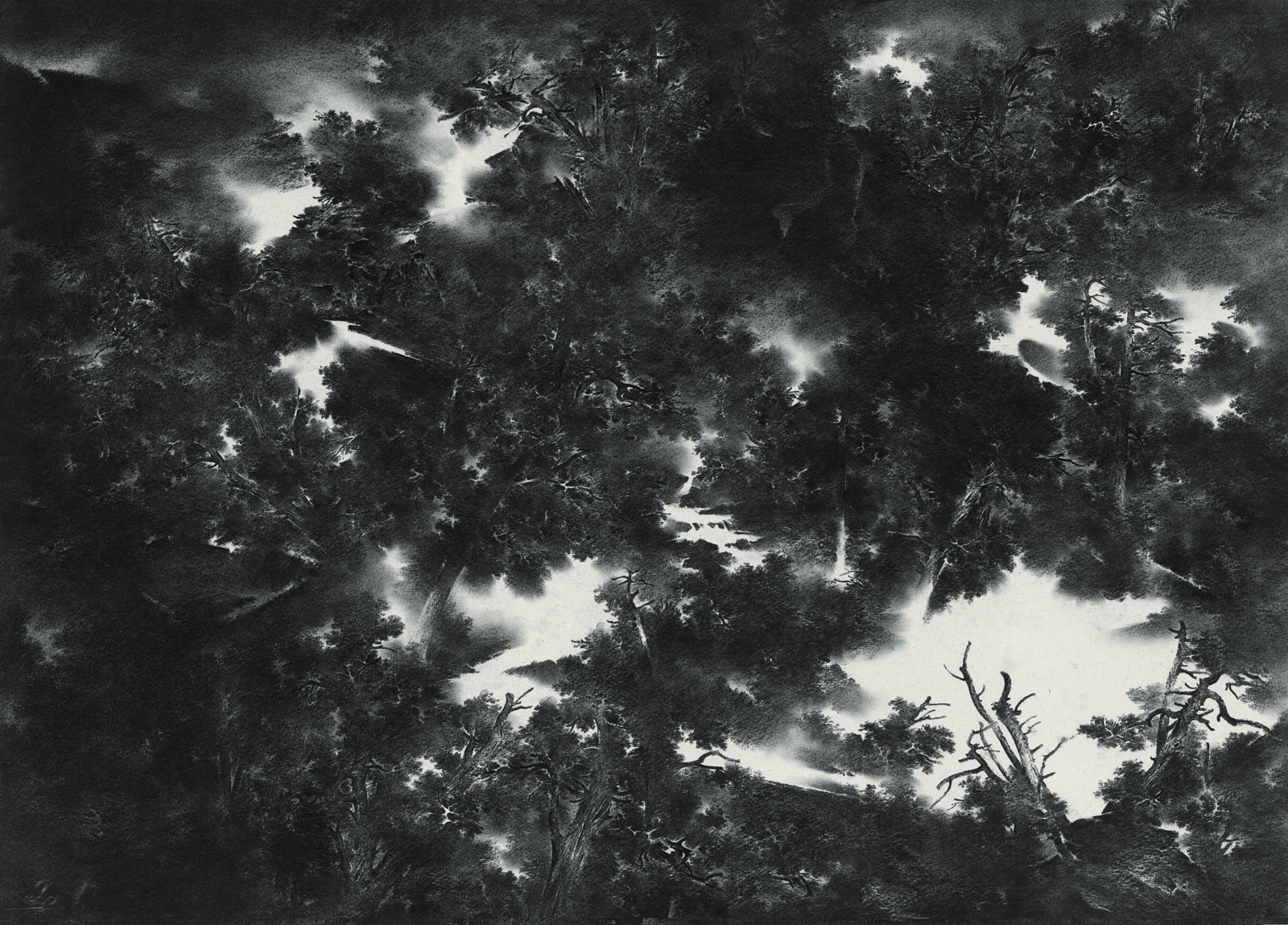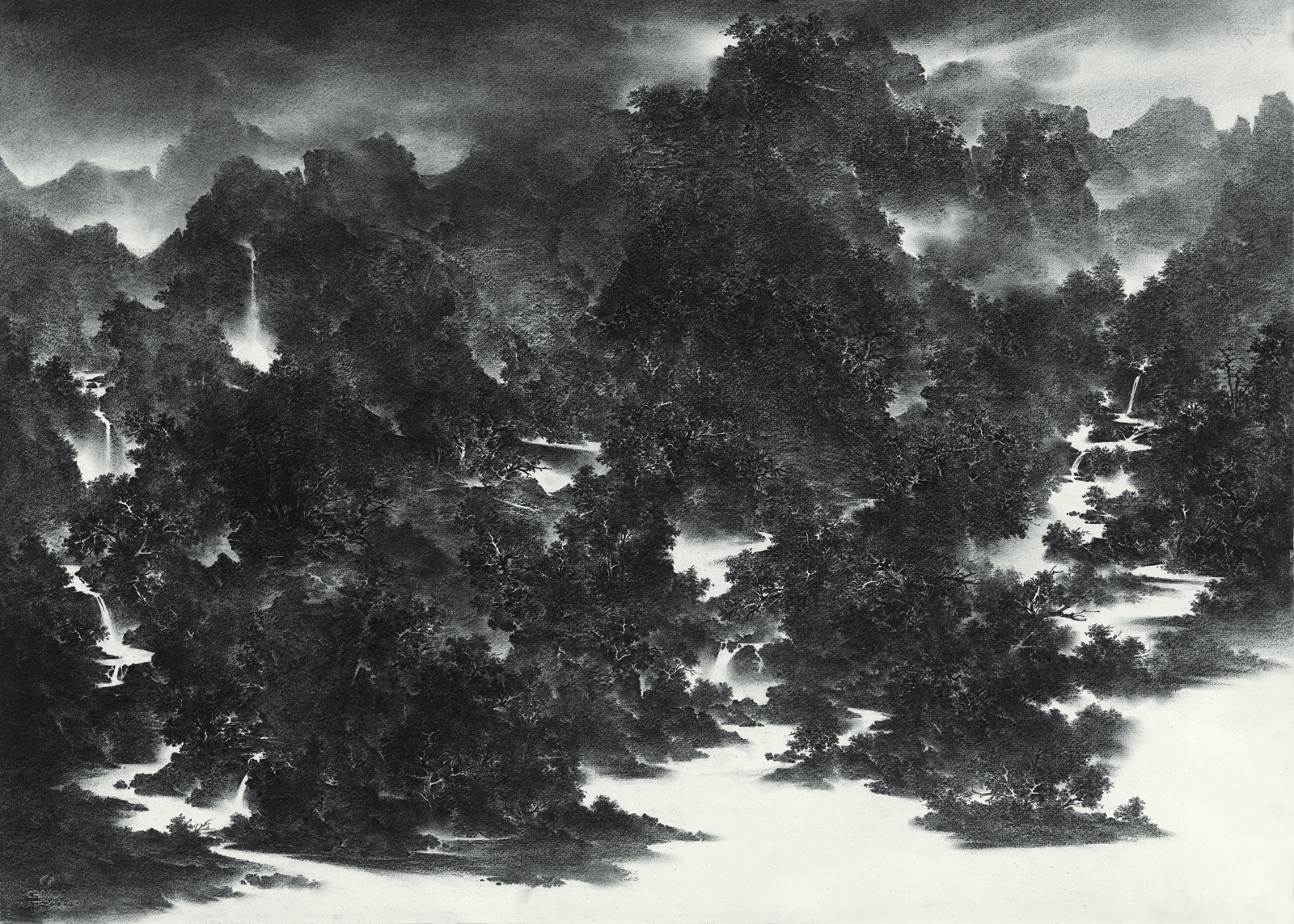 Xiaoyang has devoted himself exclusively to shanshui (Literally, ‘mountains and water’; the Chinese concept of brush-and-ink landscape painting) art for over ten years. And through all these years, each time Xiaoyang paints, it seems that he is seeking to evoke the archetypal shanshui scroll: the scroll that has endured through thousands of years, through the ravages of time, the invasions of insects, the turmoil of war, and that retains faint, misty traces still discernible on its surface. The scroll, in itself, is shanshui.
