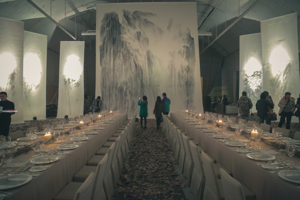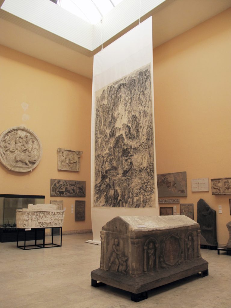 Monumental ink landscape (shanshui) paintings challenge the conceptual parameters of the modern exhibition hall, and force a consideration of alternative modes of display. In installing his monumental scrolls, Xu Longsen transforms the exhibition hall into a virtual literati garden, in which he replaces the environment of trees, flowers, and rockeries of the natural garden with the environment contained within his scrolls. This act of display within a garden by extension relates to the model of the literati gathering.