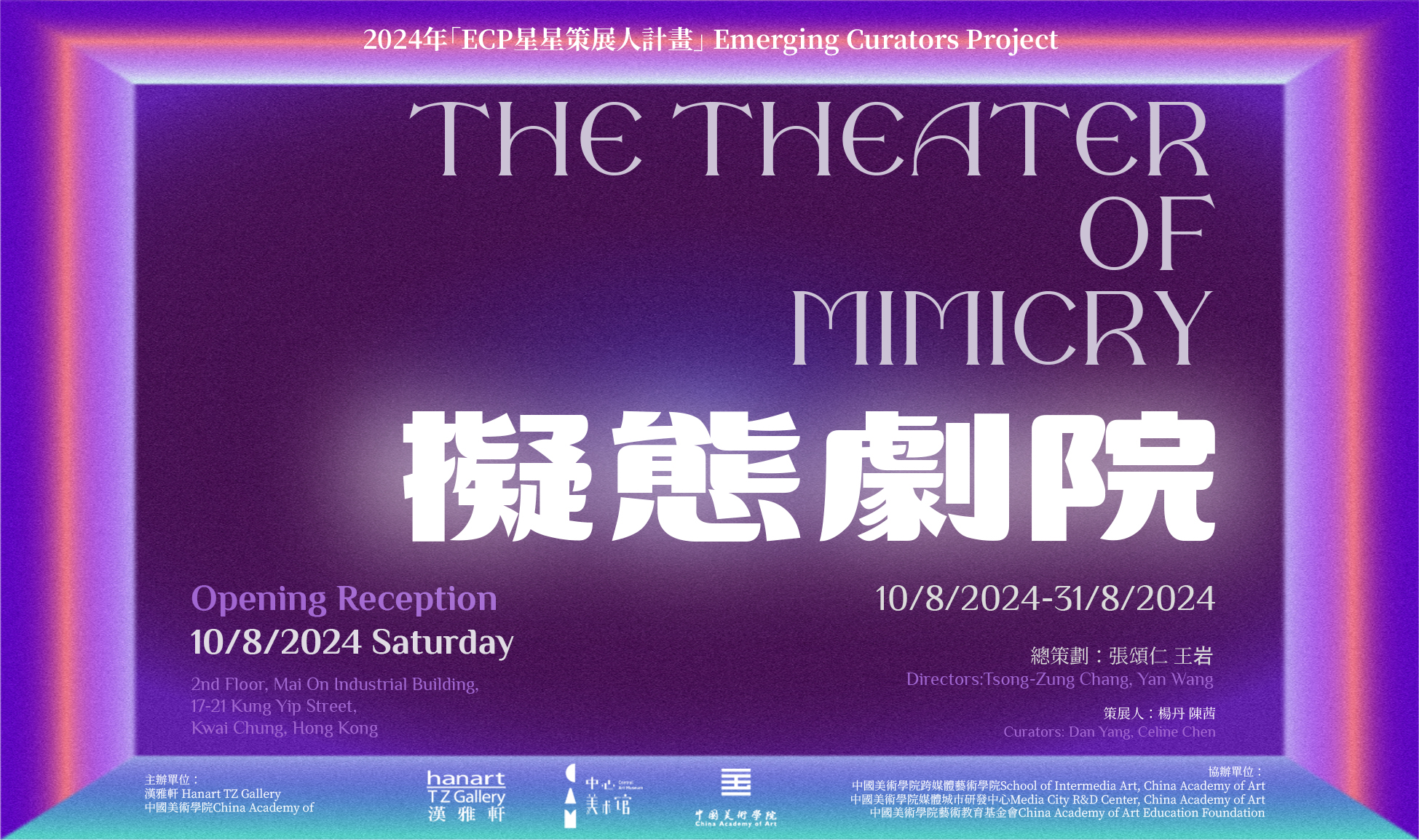 《擬態劇院》將於 8 ⽉ 10 ⽇(週六)下午 2 到 6 時在⾹港漢雅軒畫廊開幕。兩位策展⼈、部分參展藝術家和中⼼美術館館長、中國美術學院教師王岩將⼀起出席開幕跟觀眾現場交流。