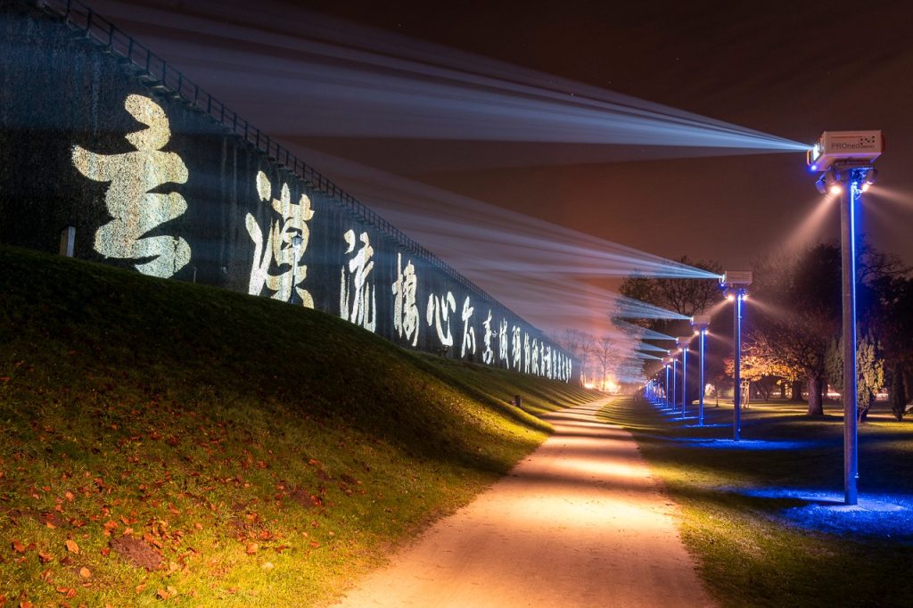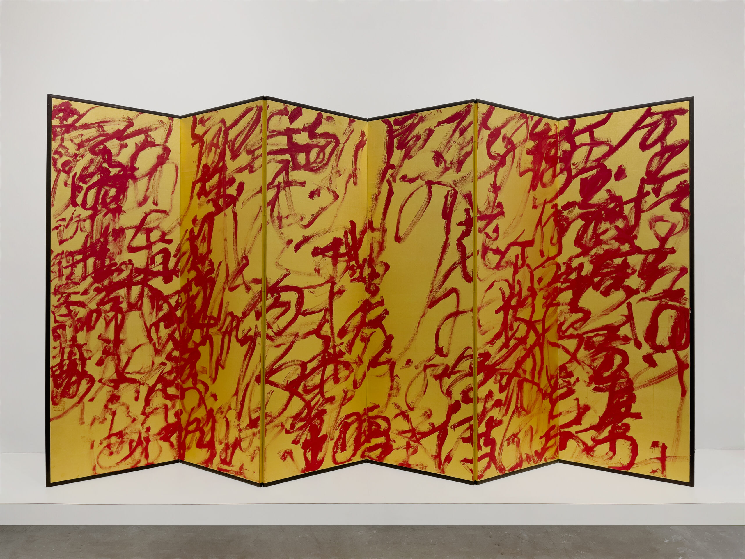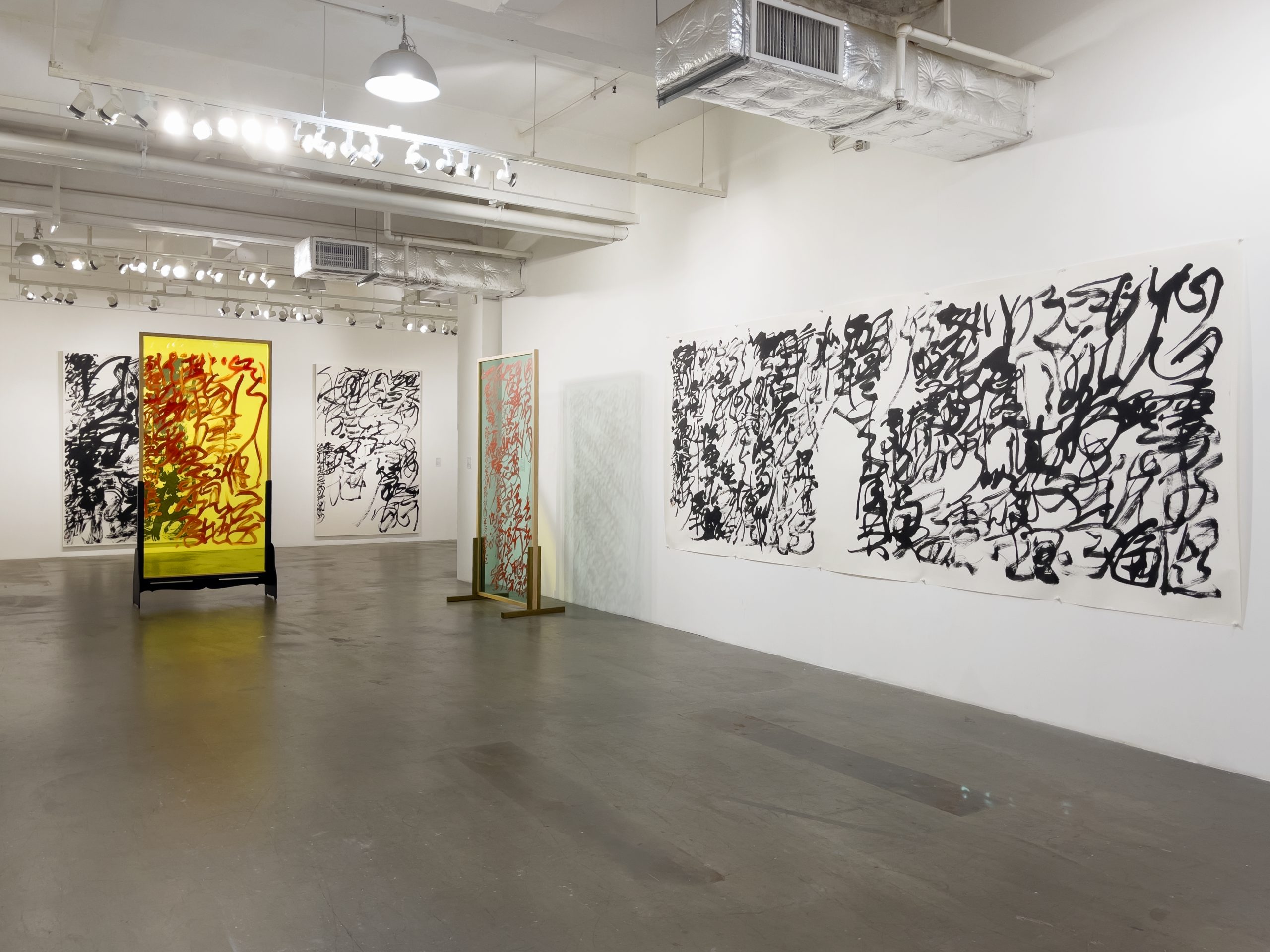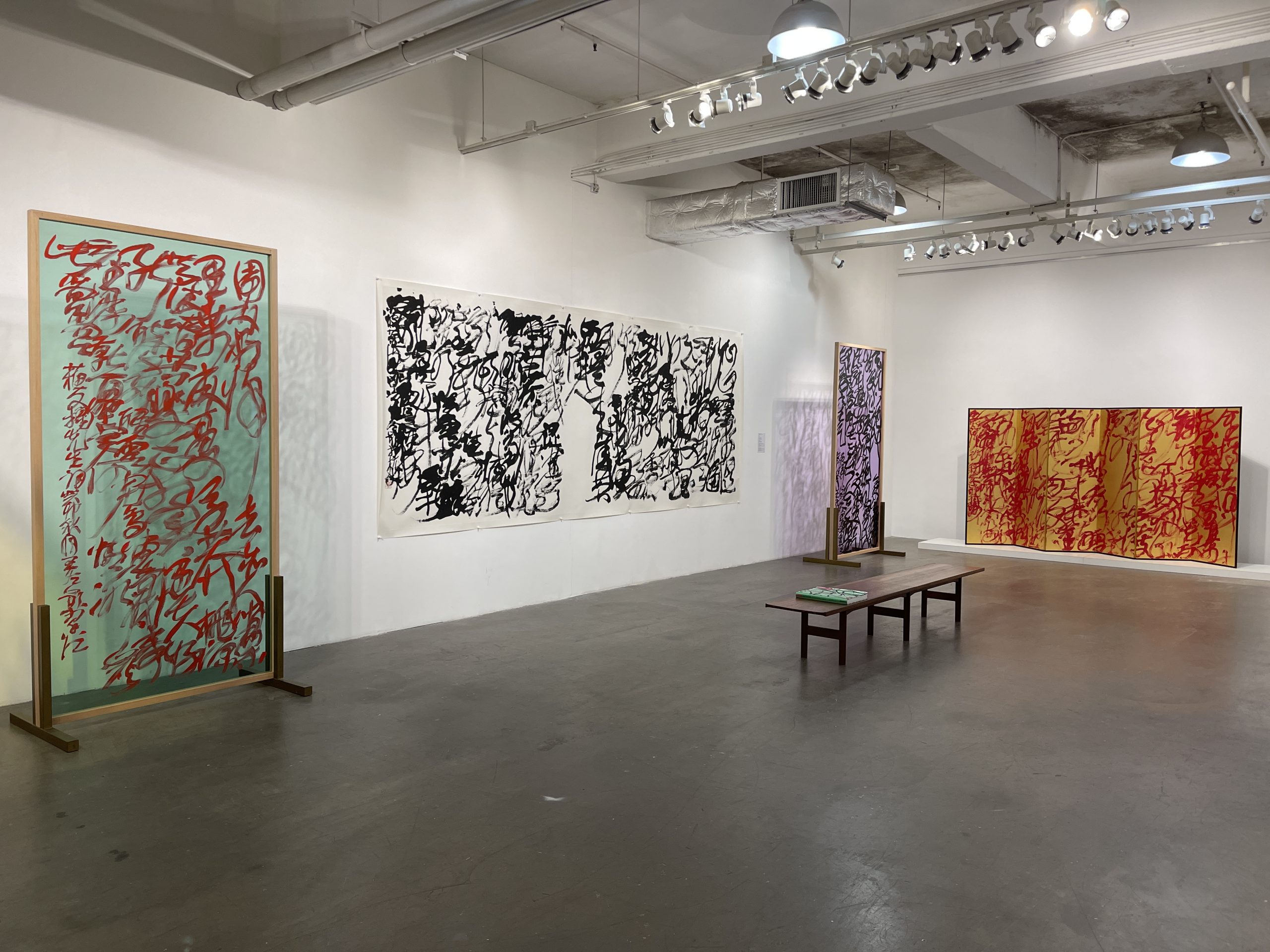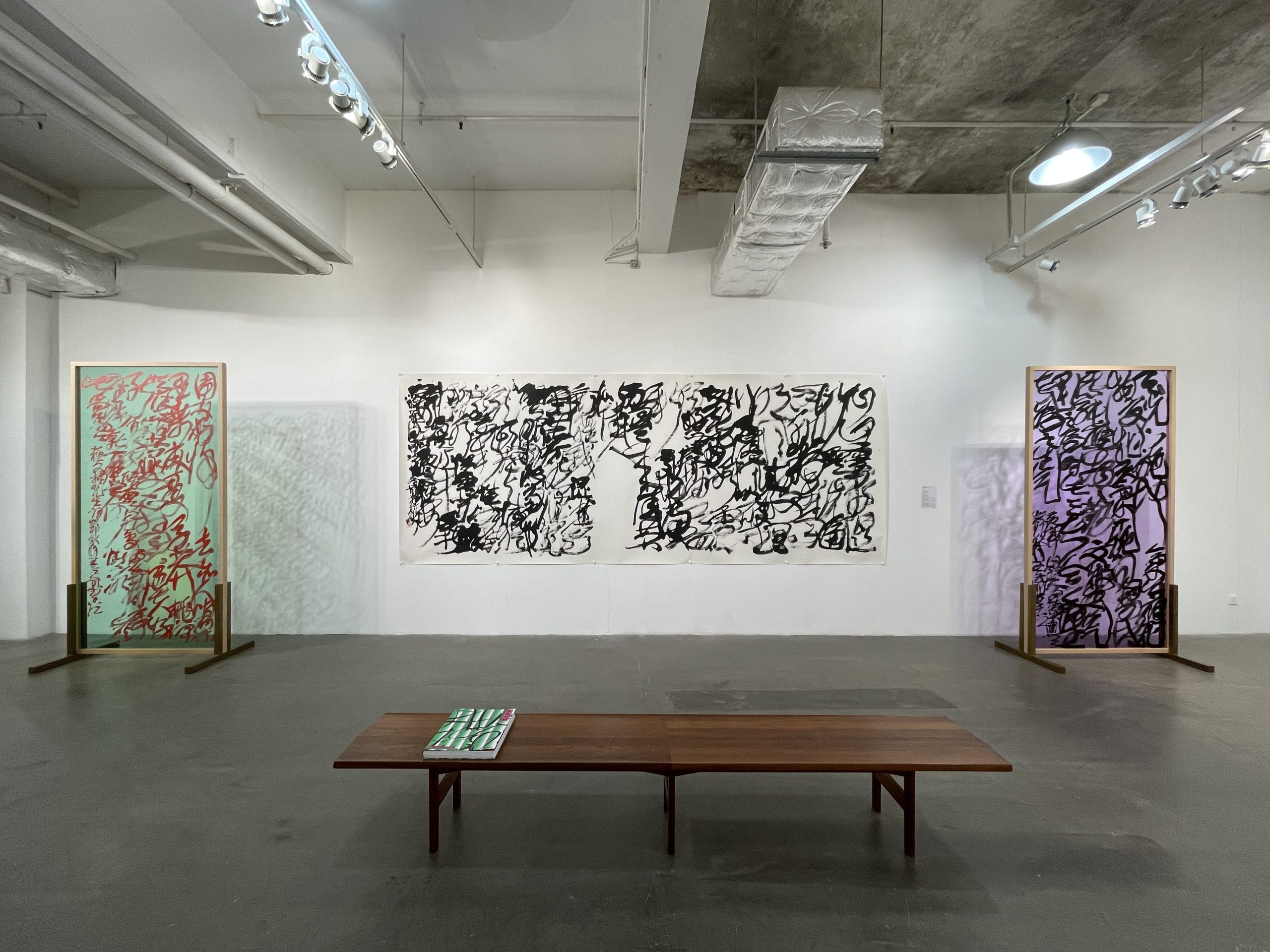 「亞克力亂書彩屏」同樣是本展覽的亮點,此類作品經常在世界各地大型美術館展示。藝術家在彩色透明板材上書寫,結合燈光在空間中展示,把書法的線條、肌理、韻律和速度轉化為一個可「游」的審美場域,觀者可身臨其境感受「亂書」的藝術張力,體驗藝術家把書寫擴展到公共空間所帶來的沖擊。