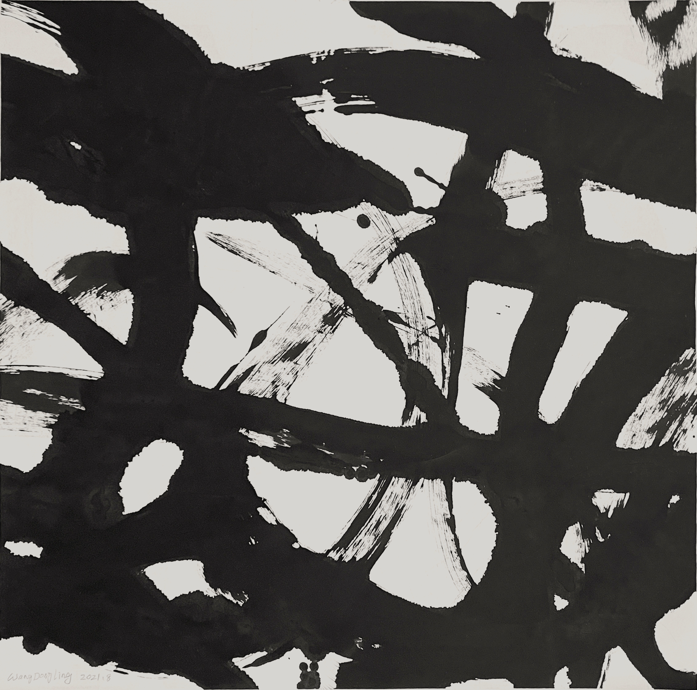 回顧王冬齡先生近年的創作歷程,「亂書」是關鍵的突破。首先說「亂」的字義。一般英譯翻譯為 chaos, 強調混沌的亂,表示無序無章法。但王先生的「亂書」,還是應該採取傳統訓詁的反訓法:「亂者,治也。」反而是治理的意思。治以浚水,理以治玉,棼絲以整治頭緒,用棼絲的比喻來說, 就是從一個沒有條理、沒有頭緒的實踐,整理出一個秩序。棼絲打開沒有解開的結,同時回歸到整理出頭緒之前的始源。所以「亂書」應該翻譯為 entangled (糾纏,解不開;不是 chaos (混沌無章)。從這個角度讀「亂書」,想到好友趙廣超給我出的題目「打開五千年的結」。文字書寫是中國文化的核心,從結繩記事開始,發展出歷代各式書體。到今天,傳統書法碰到數千年不遇的危機,迫使我們重新思考書寫、思考文字:「書法」這個以文字為基礎的「視覺藝術」應該如何看待文字? 記事言志的文字成為性情表述的載體時,如何與字義重新結合?如何回到文字的根本,回到開闢混沌、天地哭鬼神泣的始作,也即是現代藝術所謂的 radical?