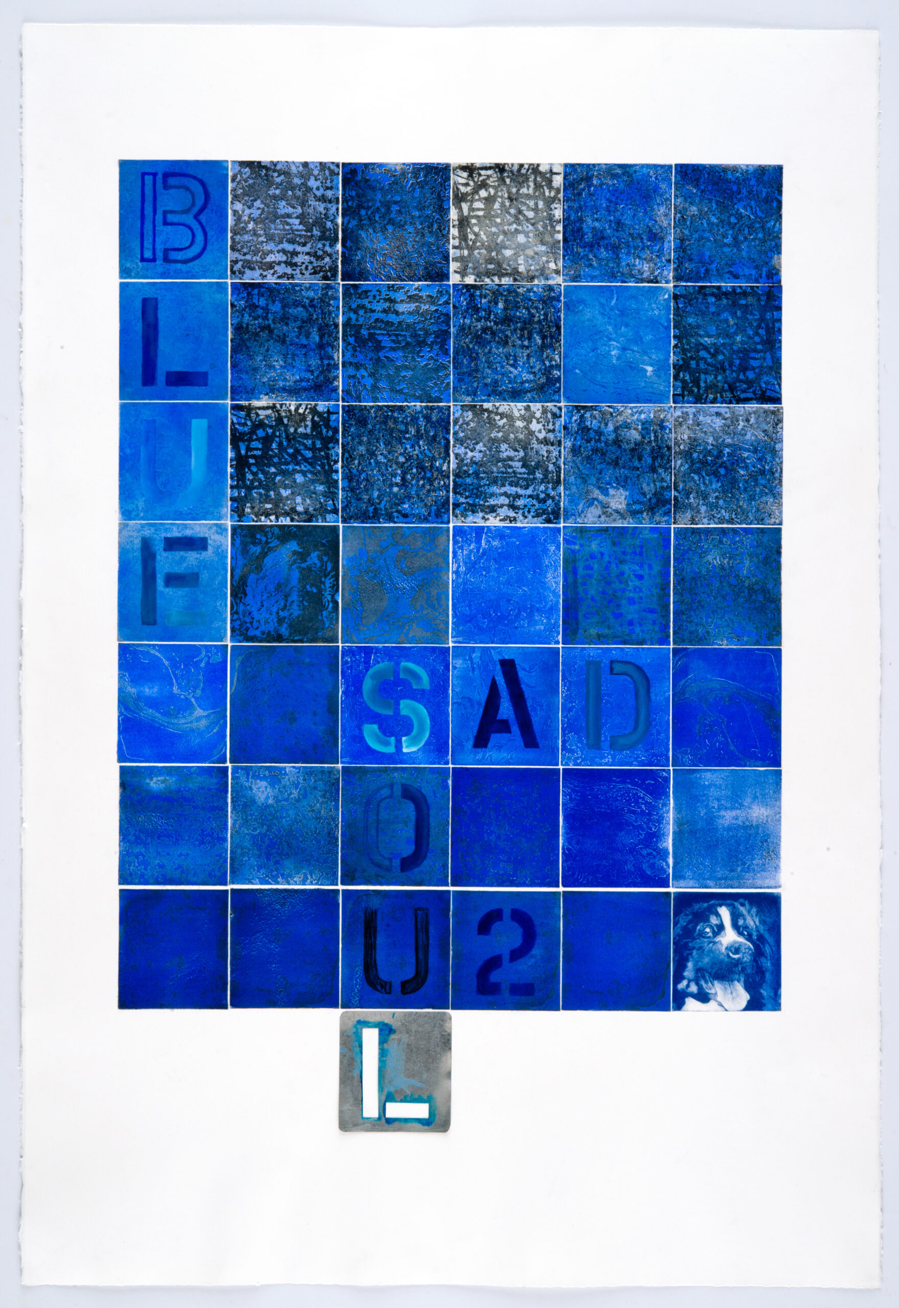 Etching, sugar-lift aquatint, mezzotint with additional hand-coloring word stencil.