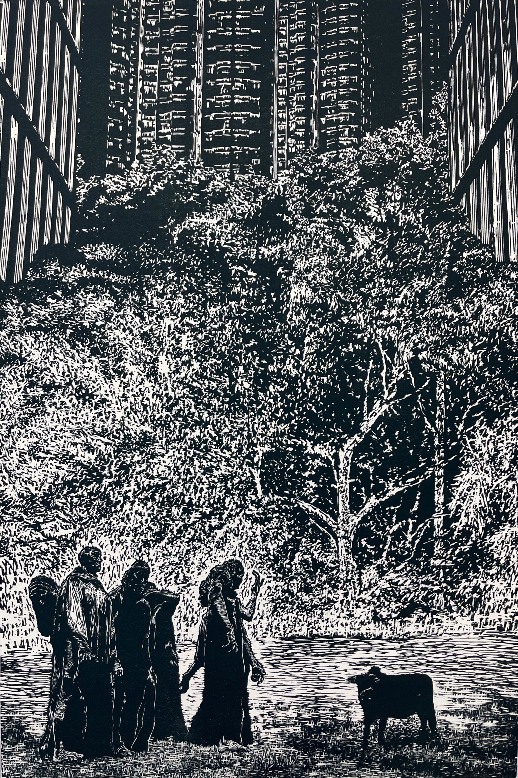 The present exhibition highlights the unique qualities of different printmaking styles, including relief, intaglio and stencil. The relief technique has continued to be relevant for centuries due to its dynamic nature and roots in various traditions. In his book Three Parallel Artworlds (2014), Chang Tsong-Zung notes the important influence of the New Chinese Woodcut Movement of the early 20th century, which promoted the creation and dissemination of realist woodcuts to highlight issues of social and political injustice. Artists Michelle FUNG and Jay LAU draw inspiration from this seminal movement in Chinese art history to elaborate on the use of woodcut prints as social critique. Fung’s Polluta woodcut series is an eco-political satire in on the visual propaganda of an imagined totalitarian colony. Loosely based on the expressionistic style of the New Chinese Woodcut Movement, Fung’s monochromatic yet radiant woodcuts represent a milestone in her decade-long project. Jay Lau’s woodcuts depict a cold and authoritarian reality dwarfing the feeble masses. The titles of his works are derived from dystopian literature. Despite its dark mood, his work contemplates the integrity and the bravery of regular people in adversity.