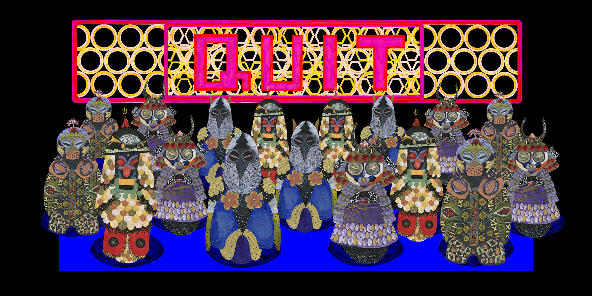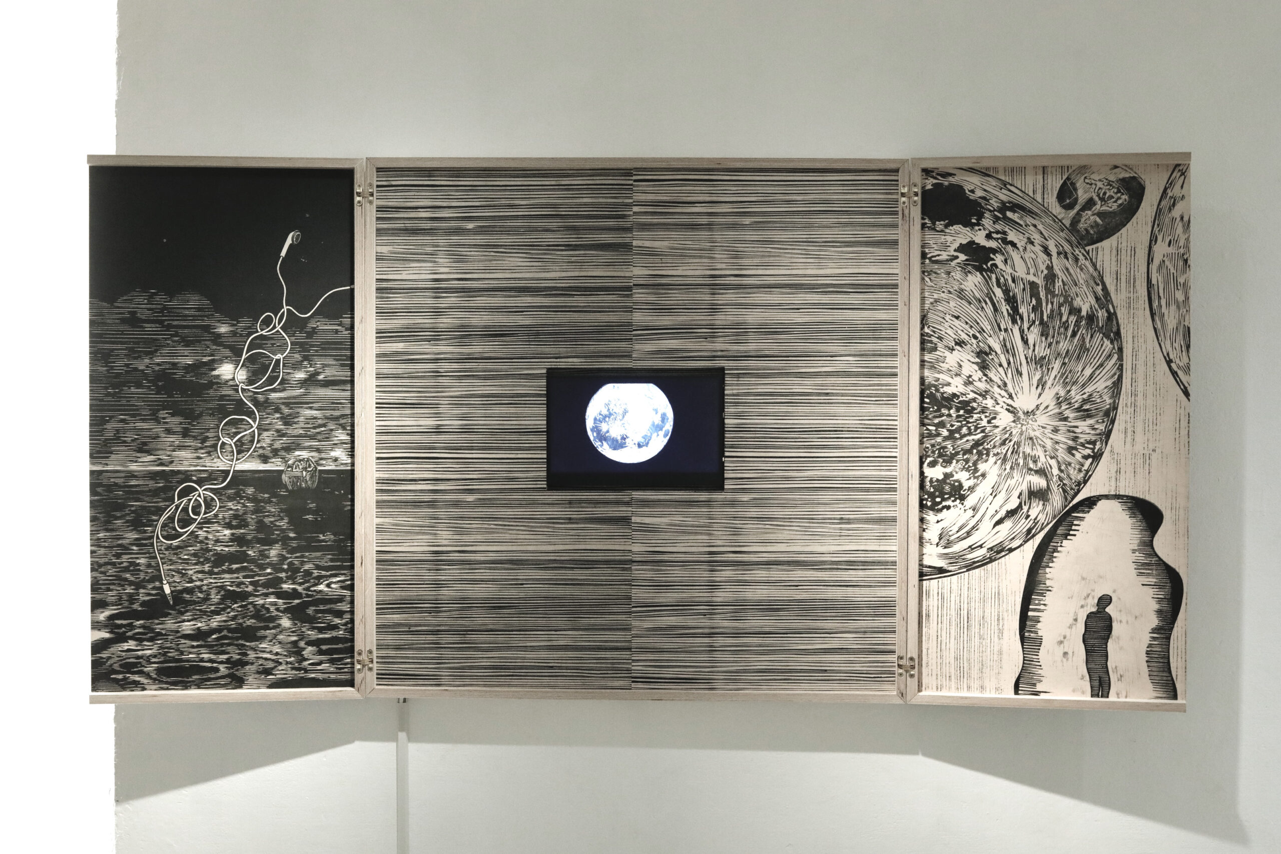 LI Ning, who has years of experience as one of Hong Kong’s top tattoo artists, has accumulated a library of self-created visual motifs. In his print work, he collages these motifs together with his own drawings, then uses both woodcut and linocut to create visually stunning black-and-white sci-fi landscapes populated with imaginary extra-terrestrial beings.
