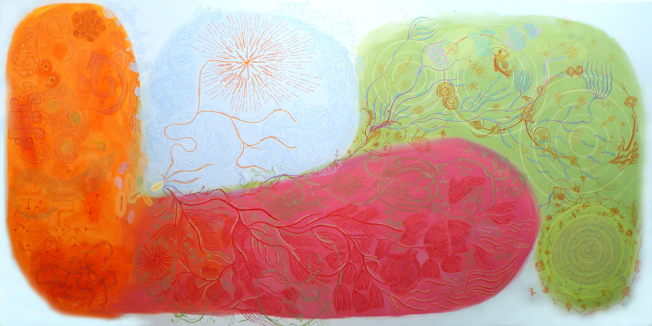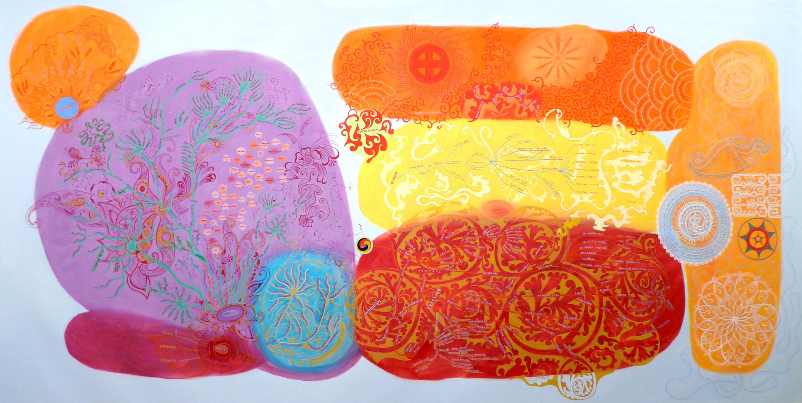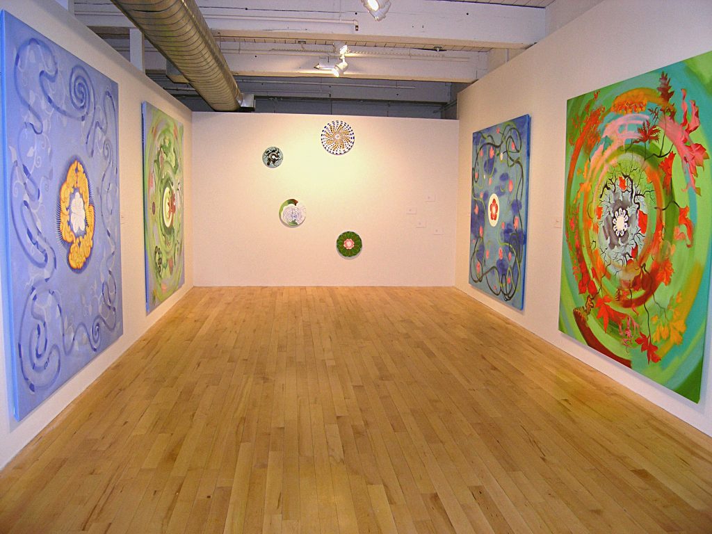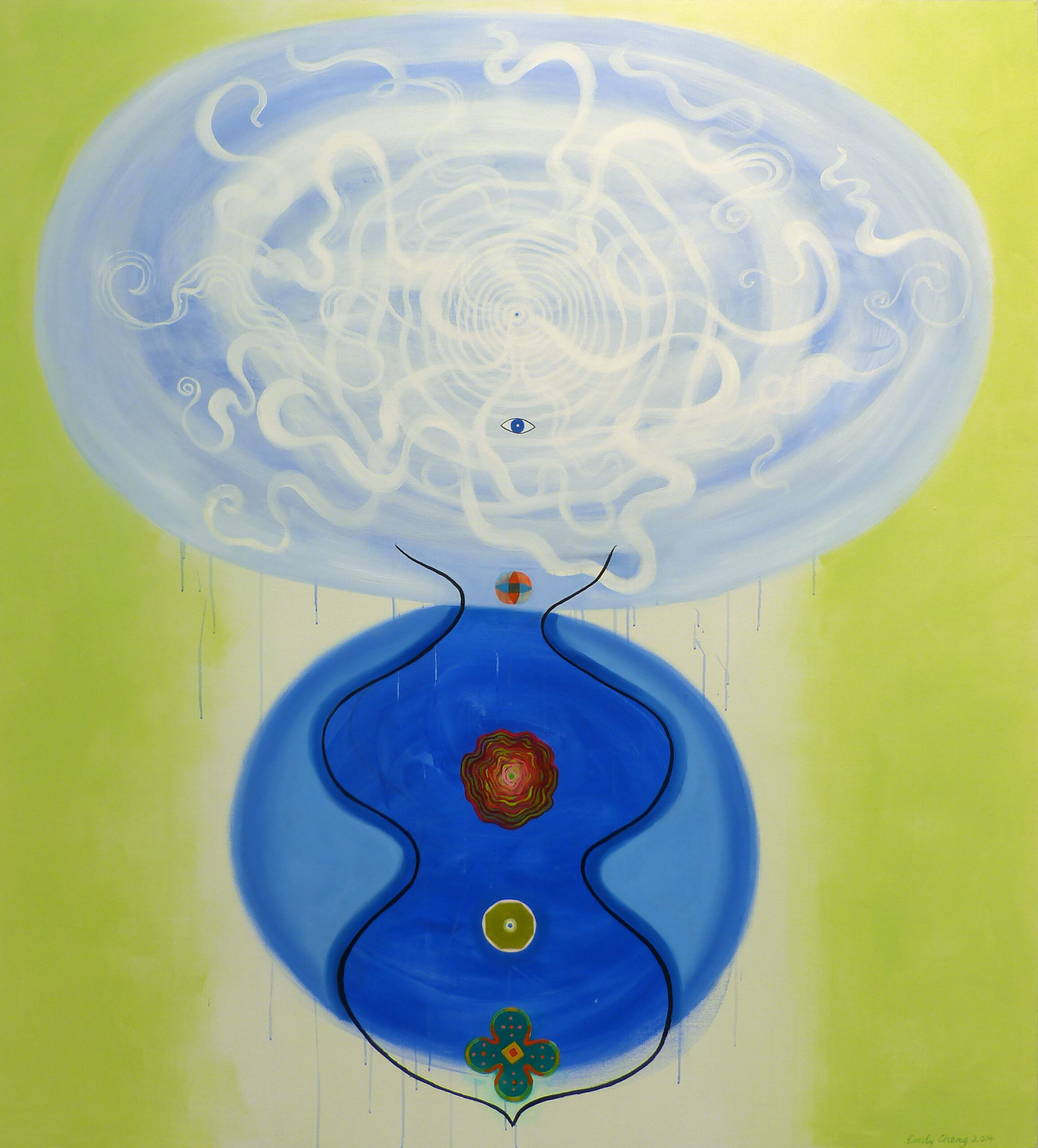 《寰天》(RoundSky)是對冥想圖像的展示,靈感來自世界各大宗教的繪畫和工藝以及藝術家的想像。作品本質上是一種探索和指示。它提出問題,並設想 了一些可能的答案。 成瑞嫻在隨意的漫遊中發現與自我相連的這些圖像。它們在畫布上呈現,以各種迥異的方式變換形狀,創造了它們的「場」。這些圖像試圖成為正凝固為最終形態的 畫面中的一個個片段。其中最大的兩幅畫作《東方和西方的傳統》(Eastern and Western Traditions)是實驗性質的作品。並被繪成大型尺寸,使得站立的觀者能在觀看過程中矯正自身的經驗。《信仰的分支,東方與西方》(Branches of Beliefs, Eastern and Western)則追蹤了諸多教派、宗派、團體,探索通往智慧的路徑。通過回看歷史以獲指引和展望未來以求光亮。而最新一批在深圳大望文化高地完成的作品則試圖尋找歷史時空與宇宙相連的途徑。